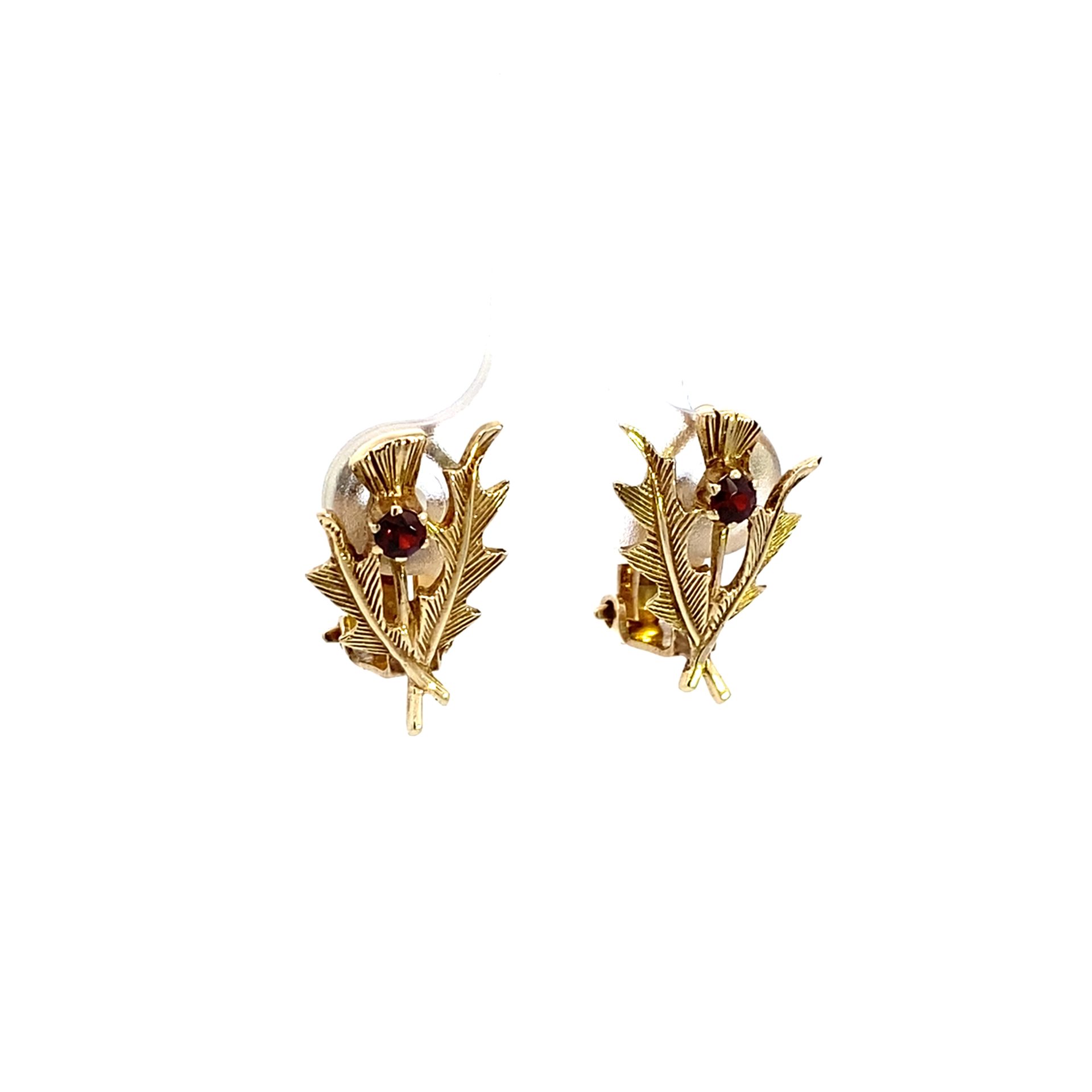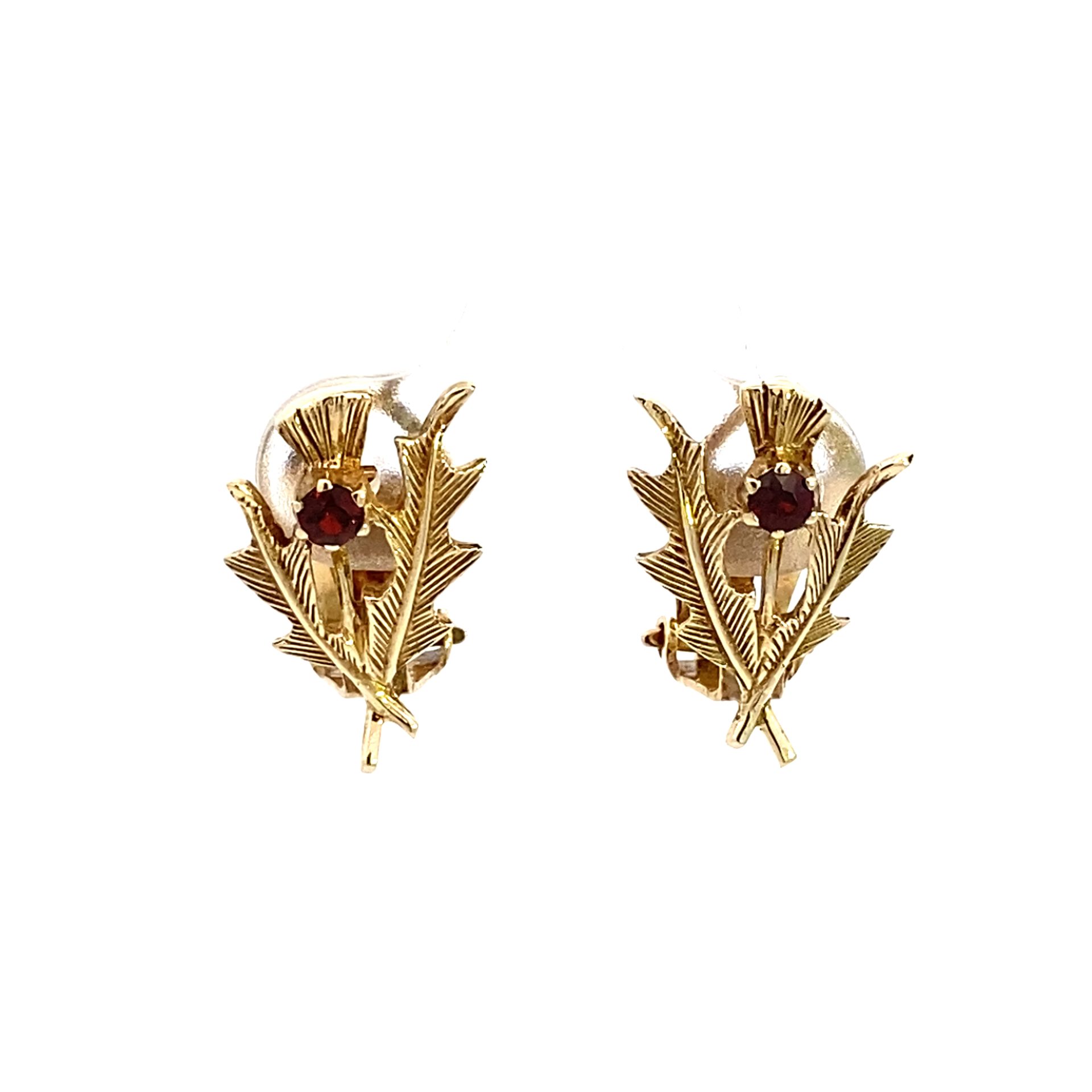 9ct Yellow Gold Leaf design clip on earrings set with a Red garnet Gemstone